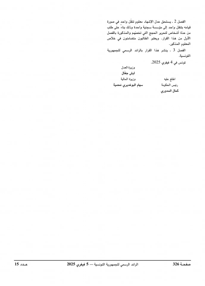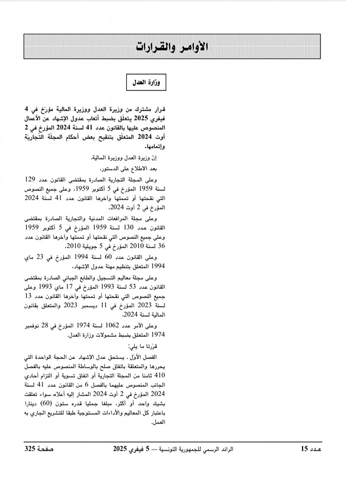 صدور قرار مشترك من وزيرة العدل ووزيرة المالية مؤرخ في 04 فيفري 2025 يتعلق بضبط أتعاب عدول الإشهاد عن الأعمال المنصوص عليها بالقانون عدد 41 لسنة 2024 المؤرخ في 02 أوت 2024 المتعلق بتنقيح بعض أحكام المجلة التجارية وإتمامها