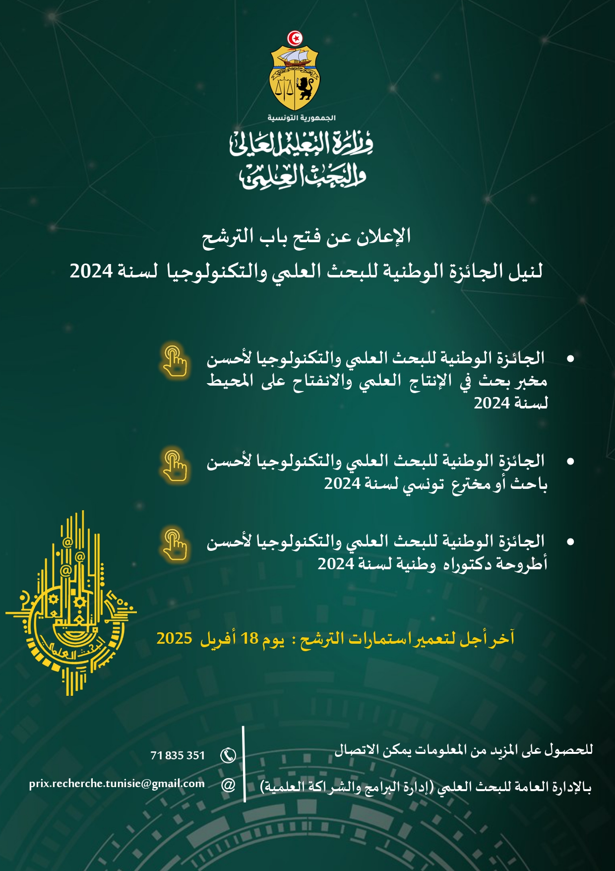 – الجائزة الوطنية للبحث العلمي والتكنولوجيا لأحسن باحث أو مخترع تونسي لسنة 2024