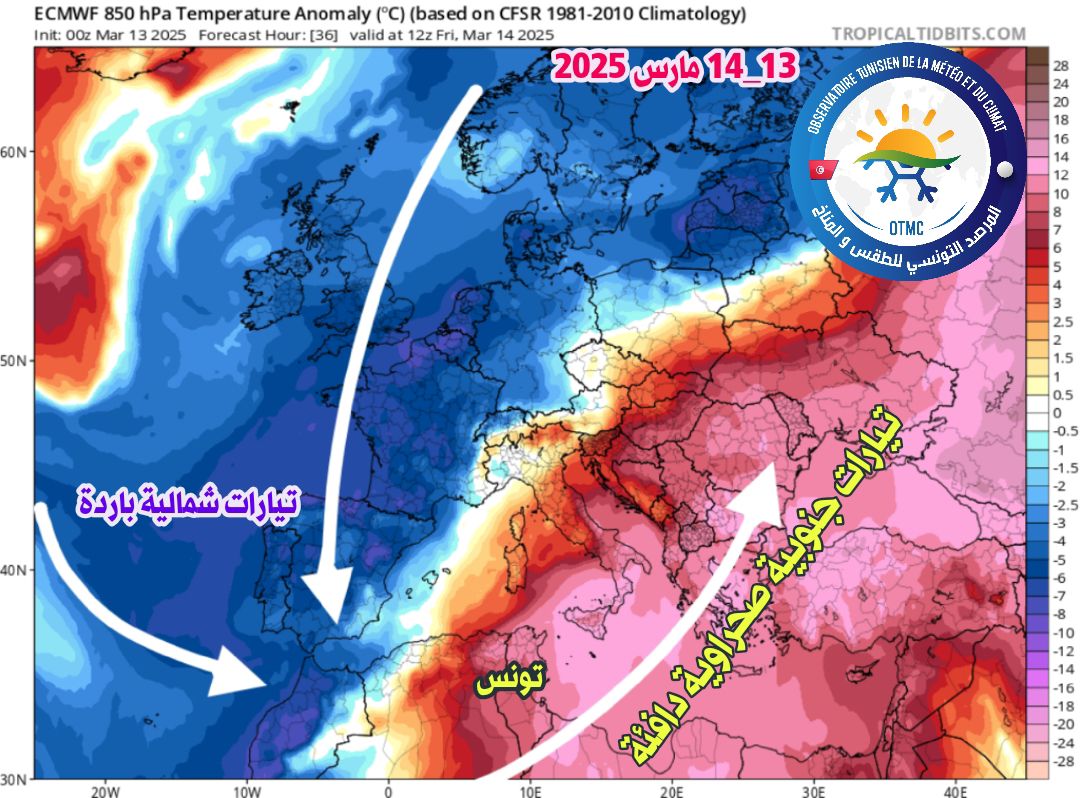 وأفاد المرصد في أخر تحيين أن المنخفضات الجوية والأمطار والكتل الهوائية الشمالية الباردة على شبه الجزيرة الإيبيرية (إسبانيا والبرتغال) والمغرب، ستسبب هبوب تيارات جنوبية صحراوية دافئة وحارّة محملة بالغبار الصحراوي من الصحراء الكبرى الإفريقية نحو تونس وليبيا وجنوب إيطاليا وشرق أوروبا حيث ستتجاوز الحرارة القصوى في هذه الدول معدلات مارس بأكثر من 10° وأحيانا أكثر من 15° اليوم و غدا الجمعة 14 مارس 2025.
