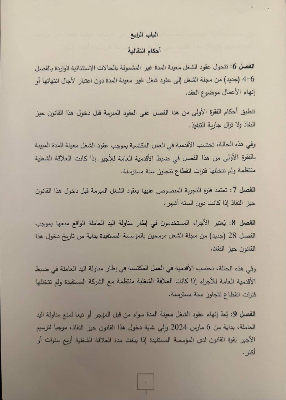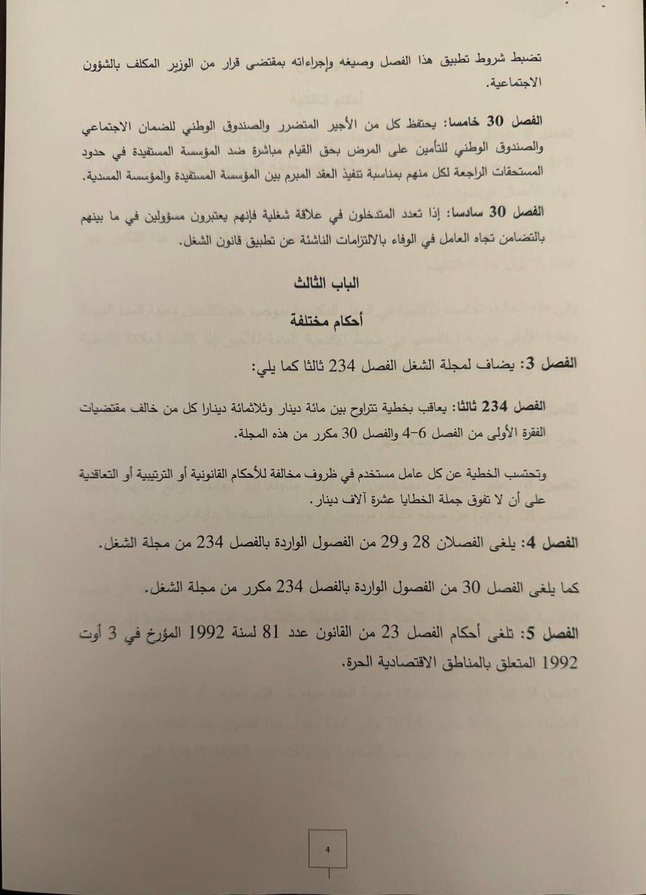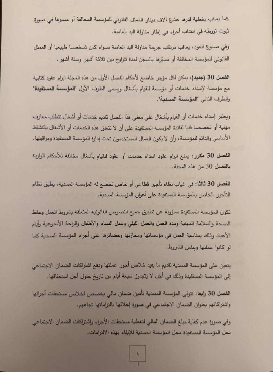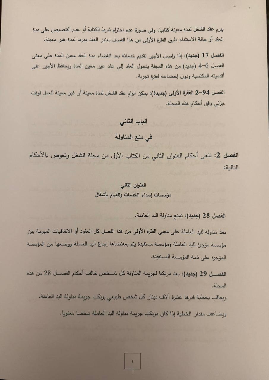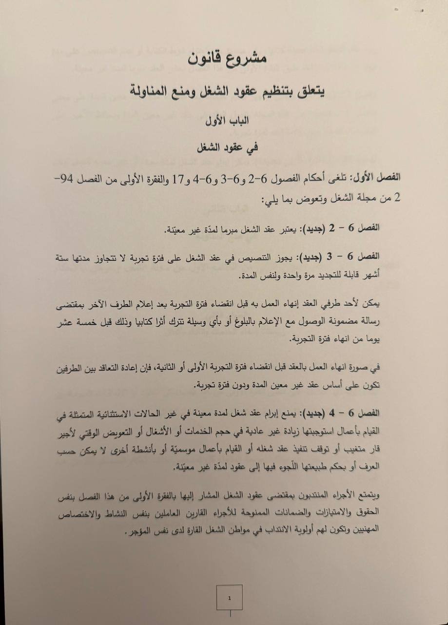 تسريبات لمشروع القانون المتعلّق بتنظيم عقود الشغل و منع المناولة الذي تداول فيه مجلس الوزراء المنعقد، يوم أمس الخميس، بقصر قرطاج و لساعات طويلة تحت إشراف سيادة رئيس الجمهورية قيس سعيّد.