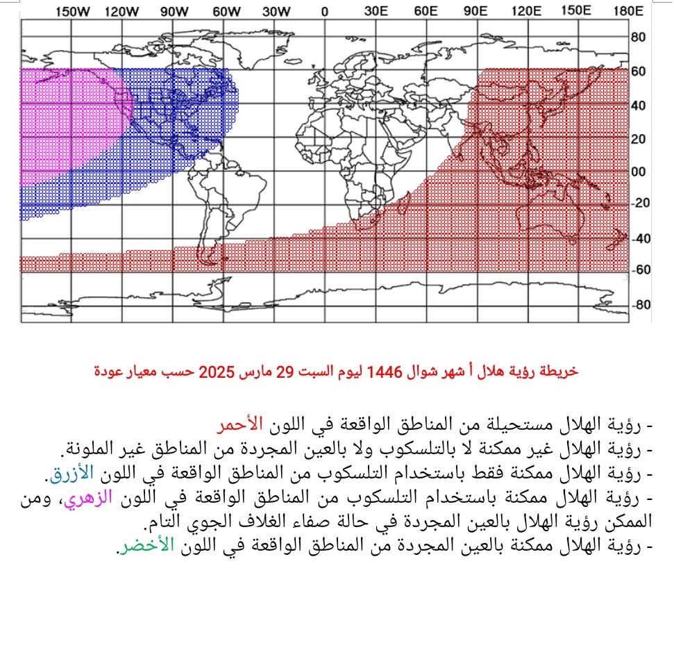 رؤية الهلال غير ممكنة لا بالتلسكوب ولا بالعين المجردة بالنسبة للقارة الإفريقية والقارة الأوروبية ولجنوب القارة الأمريكية وتكون مستحيلة بالنسبة للقارة الأسيوية.