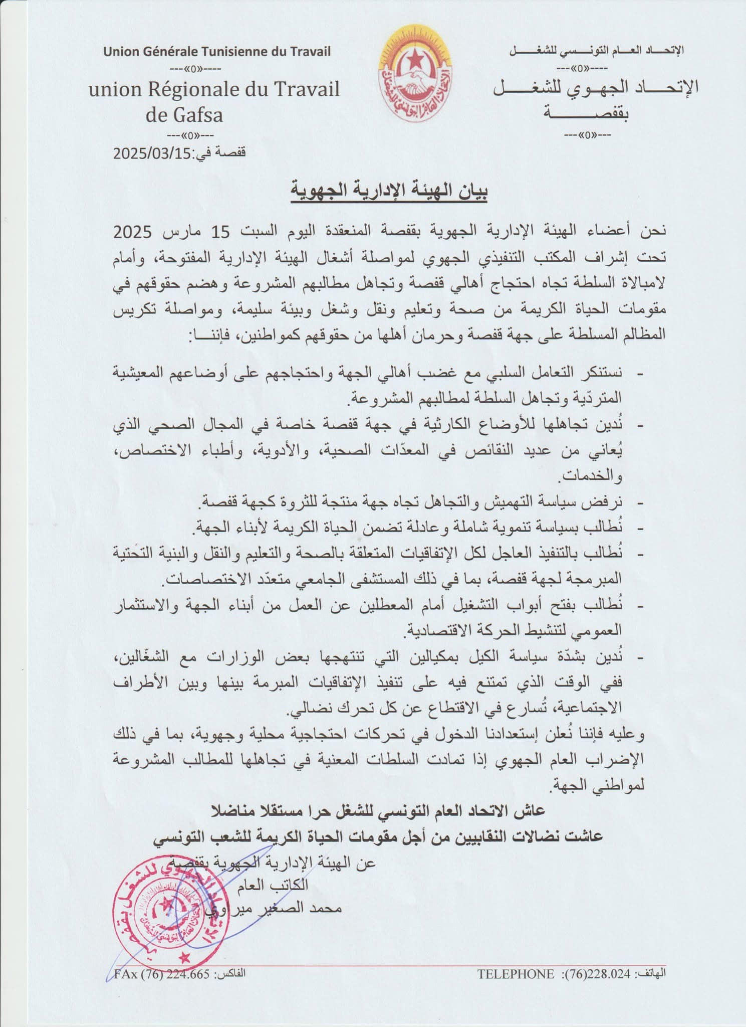 عبّر الإتحاد الجهوي للشغل بقفصة في بيان عقب انعقاد هيئته الإدارية الجهوية السبت الماضي عن استعداده لخوض عدة تحركات احتجاجية محلية وجهوية ومنها إقرار الإضراب العام وذلك تنديدا بتجاهل السلط لمطالب أهالي الجهة ورفضا لسياسة التهميش والتجاهل .