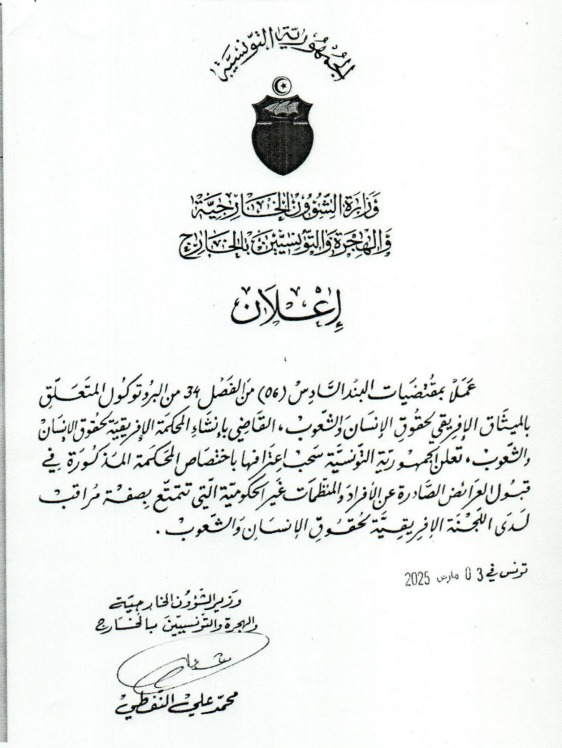 كشفت وثيقة مسربة عن إعلان تونس سحب إعترافها باختصاص المحكمة الإفريقية لحقوق الإنسان في قبول العرائض الصادرة عن الأفراد والمنظمات غير الحكومية التي تتمتّع بصفة المراقب لدى اللجنة الإفريقية لحقوق الإنسان والشعوب.
