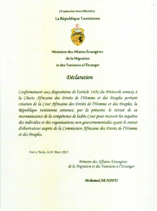 وثيقة مسربة، إعلان تونس سحب إعترافها باختصاص المحكمة الإفريقية