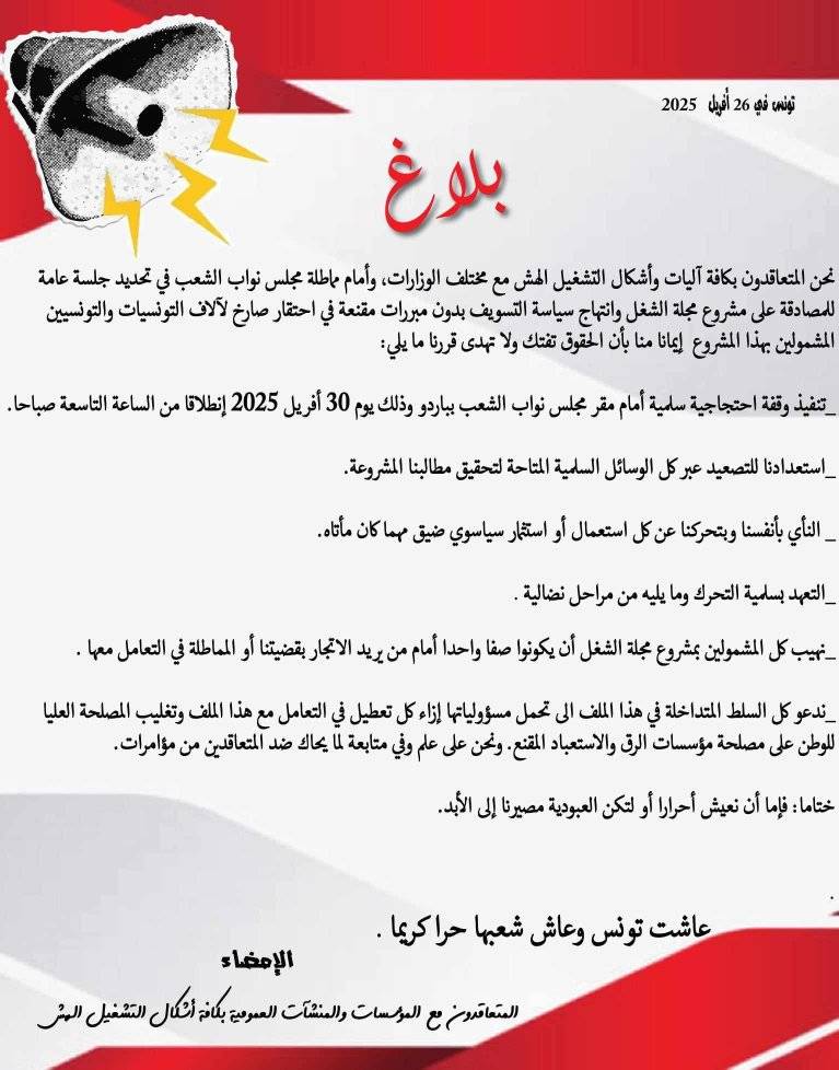 اعلن المتعاقدون مع المؤسسات والمنشأت العمومية بكافة أشكال التشغيل الهش عن تنفيذ وقفة إحتجاجية أمام مقر مجلس نواب الشعب بباردو وذلك يوم 30 أفريل 2025 إنطلاقا من الساعة التاسعة صباحا،