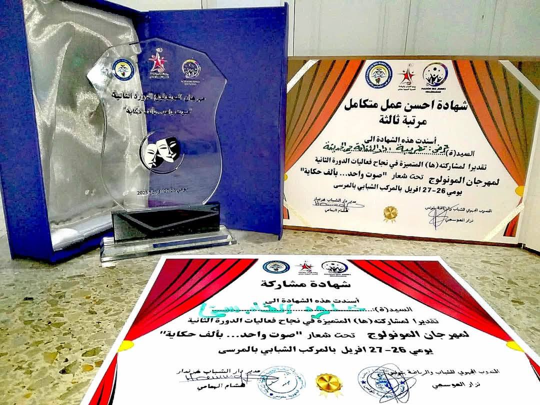وكما تحصلت على المرتبة الأولى ضمن جائزة أحسن عمل متكامل في مهرجان المونولوغ بدار الشباب خزندار بالشراكة مع المركب الشبابي المرسى. وكما تحصلت على جائزة أحسن إخراج لمهدي عبد الجواد واحسن ممثل في ذات المهرجان. وللإشارة فقد شارك في كتابة نص مسرحية “ضفائر طيبة” الذهبي المباركي وهي من إنتاج مجموعةLa Folie Théâtrale .