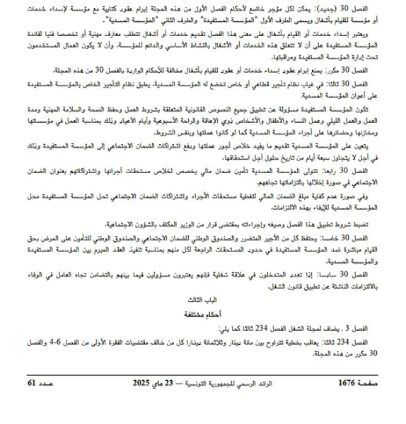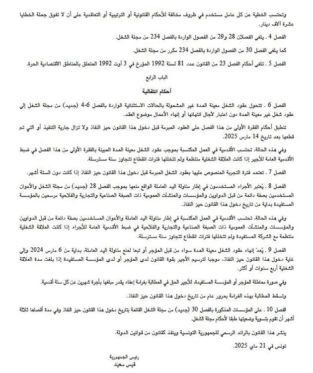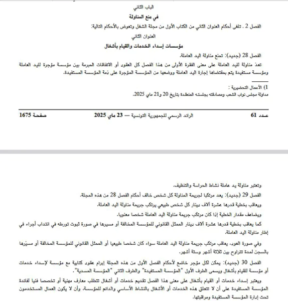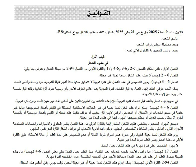 صدر بالعدد الأخير من الرائد الرسمي للجمهورية التونسية قانون أساسي عدد 9 لسنة 2025 مؤرخ في 21 ماي 2025 ويتعلق بتنظيم عقود الشغل ومنع المناولة.