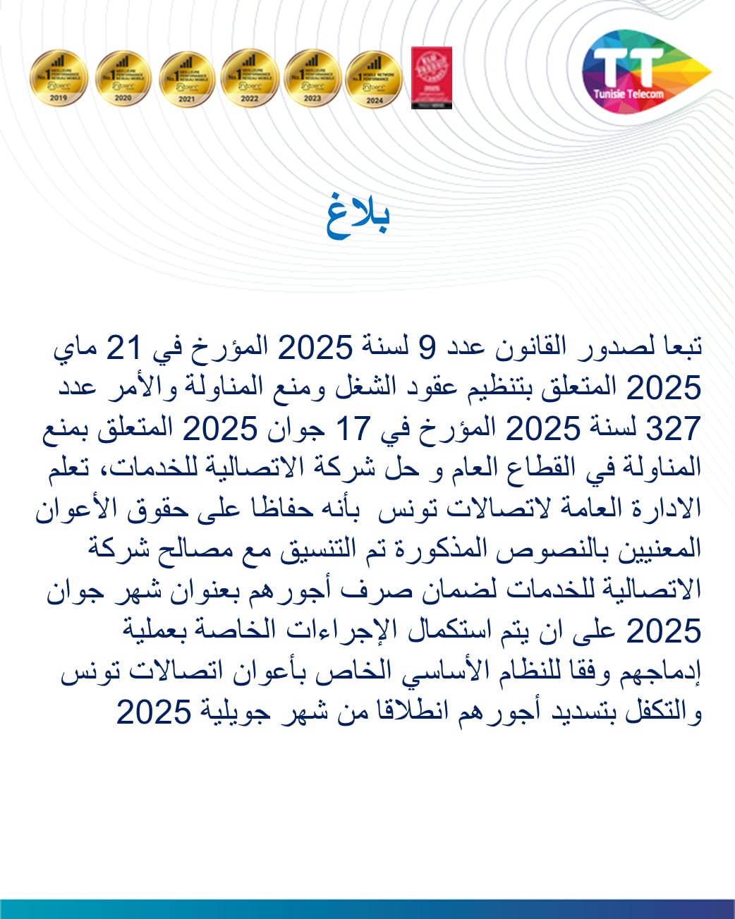 تبعا لصدور القانون عــــ9ــدد لسنــ 2025ــة المؤرخ في 21 ماي 2025 المتعلق بتنظيم عقود الشغل ومنع المناول والأمــر عــــ327 ــدد لسنـــ2025ــة المؤرخ فــي 17 جوان 2025المتعلق بمنع المناولة في القطاع العام وحل شركة الإتصالة للخدمات،