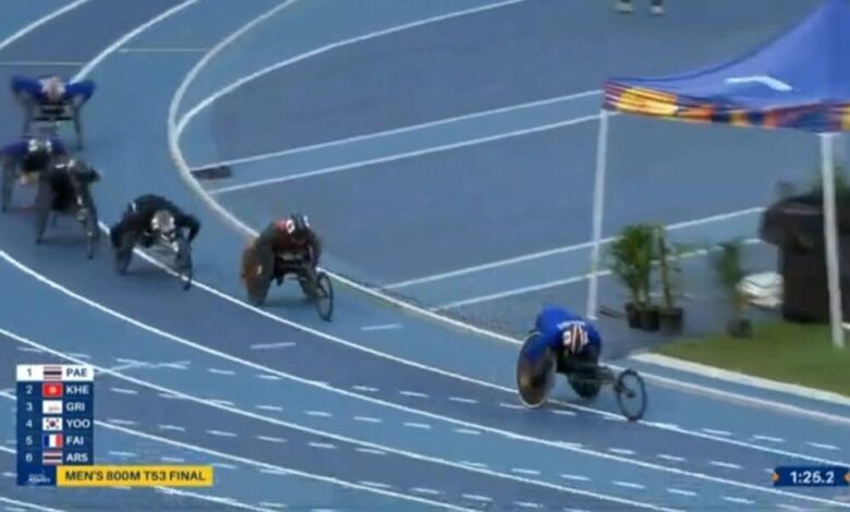 حقق البطل البارالمبي التونسي محمد نضال الخليفي، اليوم الجمعة 03 أكتوبر 2025، الميدالية الفضية في نهائي سباق 800 متر كراسي T53، محطّما الرقم القياسي الإفريقي بتوقيت 1:37.15دق ، خلال الفترة المسائية لليوم السابع من بطولة العالم بارا-ألعاب القوى، المقامة حاليا في نيودلهي الهند.