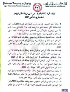 أصدرت الرابطة الوطنية لكرة القدم المحترفة اثر اجتماع اليوم الجمعة 3 اكتوبر 2025 جملة من العقوبات على المسؤولين والنوادي: