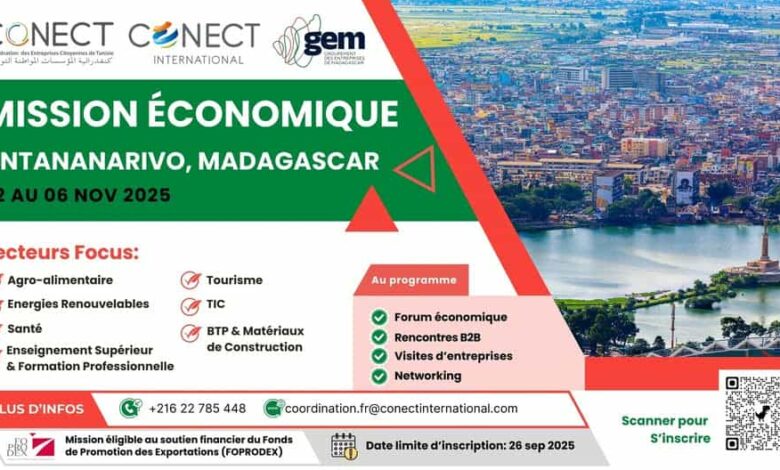 في اطار توسيع شراكاتها في القارة الافريقية تنظم كونكت الدولية، بالتعاون مع منظمة رجال الأعمال في مدغشقر (GEM)، بعثة اقتصادية تونسية إلى أنتاناناريفو، عاصمة مدغشقر، في الفترة الممتدة من 2 إلى 6 نوفمبر 2025.