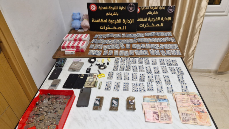 حيث تم ضبط 3 أشخاص، بينهم فتاتان على متن سيارة قبل أن يتم تفتيش أحد المنازل بجهة حي النصر، اين تمّ حجز 1200 قرص مخدر من نوع “بريغابالين” وحوالي 100 غرام “كوكايين” و4 صفائح “زطلة” ومبلغ مالي.