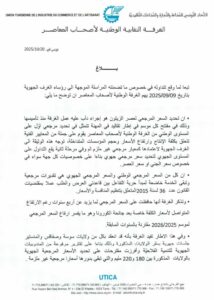 أصدرت الغرفة النقابية الوطنية لأصحاب المعاصر، التابعة للاتحاد التونسي للصناعة والتجارة والصناعات التقليدية (UTICA)، بلاغاً توضيحياً بخصوص الجدل الدائر حول تحديد الأسعار المرجعية لعصر الزيتون للموسم القادم (2025/2026).