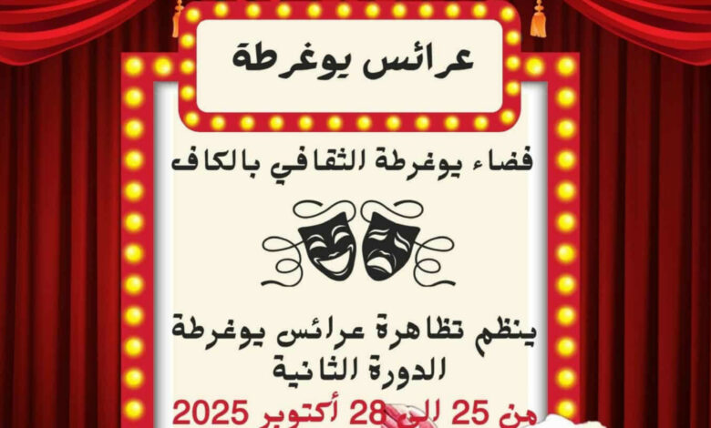 حرصا منه لتنمية ملكة الابداع والخيال لدى الطفل وتنمية لذائقته الفنية ينظم فضاء يوغرطة االثقافي بالكاف من 25 الى 28 أكتوبر الجاري فعاليات الدورة الثانية لـتظاهرة “عرائس يوغرطة”حيث تحتضن قاعة العروض”عمار بوثلجة”بالفضاء المذكور عرض مسرحية “فيل BOOK”يوم 25 أكتوبر الجاري ليتابع الاطفال يوم 26 أكتوبر الجاري عرض مسرحية”بوب مبعوث القيصر”ويكون لهم موعد يوم 27 أكتوبر الجاري مع عرض بعنوان “أوبيرات الصبية الحالمة”لتتوّج سلسلة هذه العروض يوم 28 اكتوبر الجاري مع عرض”عشتاروت”