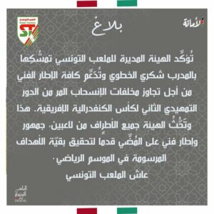 أعلنت إدارة الملعب التونسي تمسكها بالمدرب شكري الخطوي ودعم كافة الإطار الفني من أجل تجاوز مخلفات الانسحاب من الدور التمهيدي الثاني من مسابقة كأس الكاف.