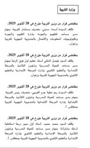 صدرت بالعدد الاخير للرائد الرسمي للجمهورية التونسية بتاريخ 28 أكتوبر 2025 تسميات جديدة بوزارة التربية وفي ما يلي التفاصيل: