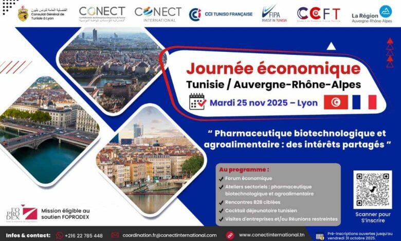 في هذا الاطار ستنظم كونكت الدولية يوم الثلاثاء 25 نوفمبر 2025 بالتعاون مع قنصلية تونس في مدينة ليون الفرنسية والمجلس الإقليمي لأوفرن-رون-ألب اليوم الاقتصادي لتونس بهذه الجهة الفرنسية ذات الحركية الاقتصادية المهمة وسيكون اليوم تحت شعار “الصناعات الدوائية، والتكنولوجيا الحيوية، والصناعات الغذائية الزراعية: مصالح مشتركة”