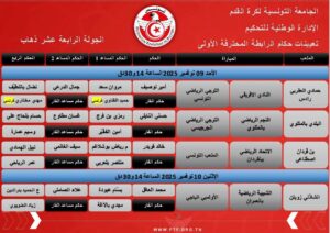 كشفت الإدارة الوطنية للتحكيم عن حكام مباريات الجولة 14 من الرابطة المحترفة الأولى لكرة القدم، وفي مايلي تعيينات حكام الجولة: