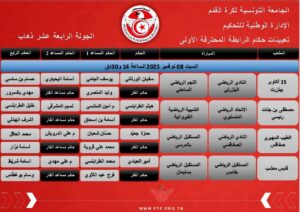 كشفت الإدارة الوطنية للتحكيم عن حكام مباريات الجولة 14 من الرابطة المحترفة الأولى لكرة القدم، وفي مايلي تعيينات حكام الجولة: