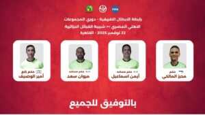وسيساعد المالكي كل من أيمن إسماعيل ومروان سعد، فيما أسندت مهمة الحكم الرابع لأمير لوصيف.