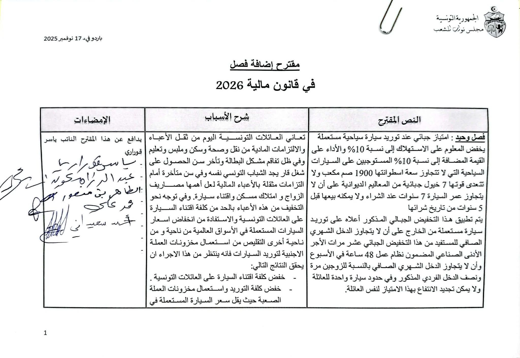 قام مجموعة من النواب بإيداع مقترح جديد بمكتب مجلس نواب الشعب قصد اضافة فصل في مشروع قانون المالية يسمح للمواطن التونسي المقيم بتونس بتوريد سيارة مستعملة من الخارج مع دفع معاليم منخفضة.. في انتظار المصادقة عليه..