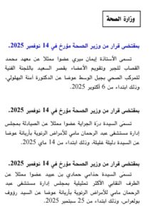 صدرت بالعدد الاخير للرائد الرسمي للجمهورية التونسية بتاريخ 14 نوفمبر 2025 تسميات جديدة بوزارة الصحة وفي ما يلي التفاصيل :