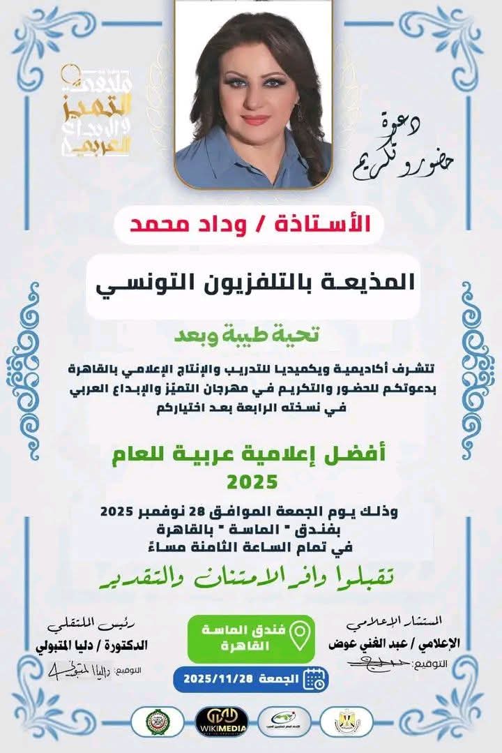 الرئيسية/الإعلامية التونسية وداد محمد تحرز على لقب أفضل مذيعة عربية لعام 2025/db49f88d-6afc-4978-be8a-7376d7622443 db49f88d-6afc-4978-be8a-7376d7622443
