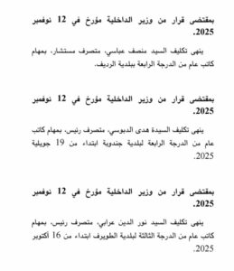 تم بمقتضى قرار صادر عن وزير الداخلية ورد بالعدد الاخير للرائد الرسمي للجمهورية التونسية بتاريخ 28 نوفمبر 2025 انهاء مهام هؤلاء المسؤولين من مهامهم بكل من بلدية الرديف وبلدية جندوبة وبلدية الطويرف من ولاية الكاف..