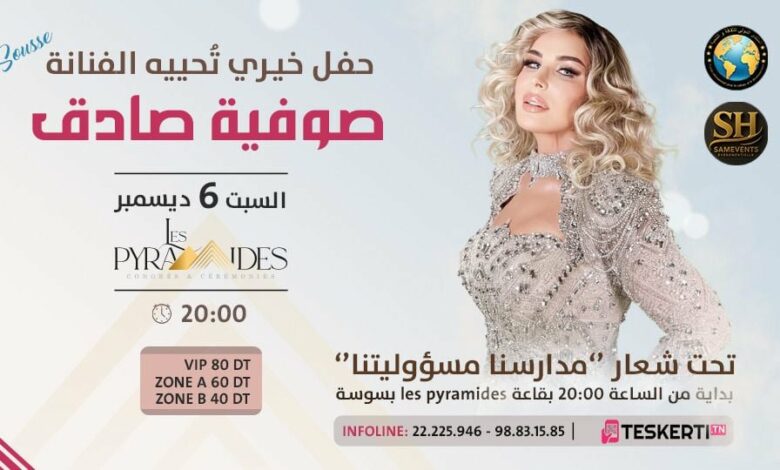 وحسب ما أفادتنا به الاستاذة سميرة صلوحي المكلفة بالتظاهرات الثقافية بالجمعية فان هذا الحفل سيكون يوم 6 ديسمبر الجاري بقاعة البيراميد بسوسة حيث تخصص نسبة هامة من مداخيل هذه السهرة التي تجمع بين الفن والعطاء والأمل لمشاريع الجمعية المنظمة حيث تخصص للاعمال الخيرية وخاصة لترميم عدد من المدارس ولانشطة صحية مجانية للمحتاجين في توظيف نبيل للفن في عمل انساني حيث ستحيي الفنانة صوفية صادق الحفل مجانا بتطوّع نبيل منها لمساندة الاعمال الخيرية وبهذا الحفل تعلن هذه الفنانة عودتها لأجواء الحفلات الفنية والسهرات الثقافية والمهرجانات خارج ركح مهرجان قرطاج الدولي حيث من المنتظر ان تؤثث سهرات المهرجانات الصيفية لسنة 2026 بعدد هام من الجهات الداخلية”.