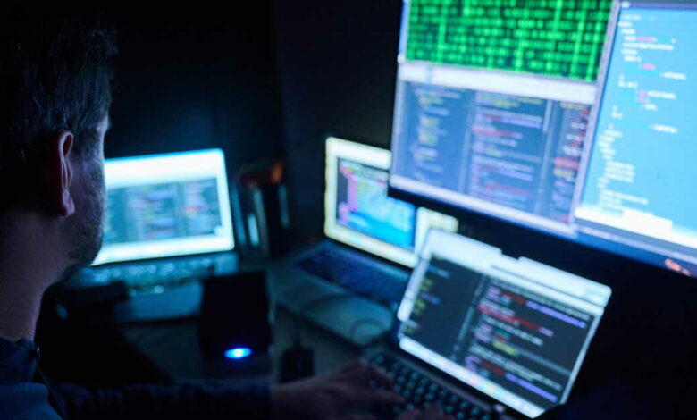 PRODUCTION - 12 February 2023, Berlin: Illustration: Fictitious html pages and hacker programs are shown on screens while a man has his hands on the keyboard. Photo: Annette Riedl/dpa (Photo by Annette Riedl / DPA / dpa Picture-Alliance via AFP)