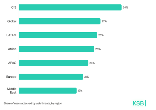 على الصعيد العالمي، تأثر 27% من المستخدمين بتهديدات الويب، وهي هجمات تستهدف مستخدمي الإنترنت أثناء التصفح. ورغم أن هذه البرمجيات الخبيثة لا ترتبط حصريًا بالنشاط عبر الإنترنت، فإنها تحتاج في مرحلة من مراحلها إلى استخدام الشبكة لإحداث الضرر.