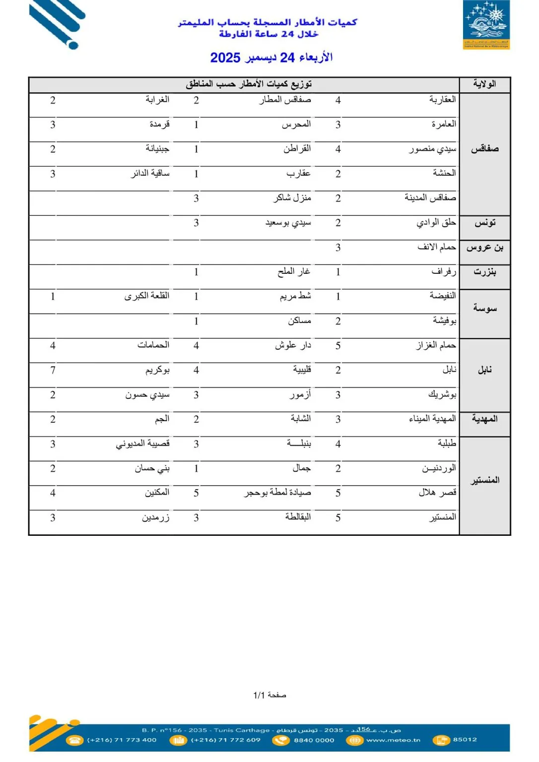نشر المعهد الوطني للرصد الجوي على صفحته الرسمية على فيسبوك قائمة بكميات الأمطار المسجلة بكامل مناطق الجمهورية خلال الـ24 ساعة الماضية وهي على النحو التالي: