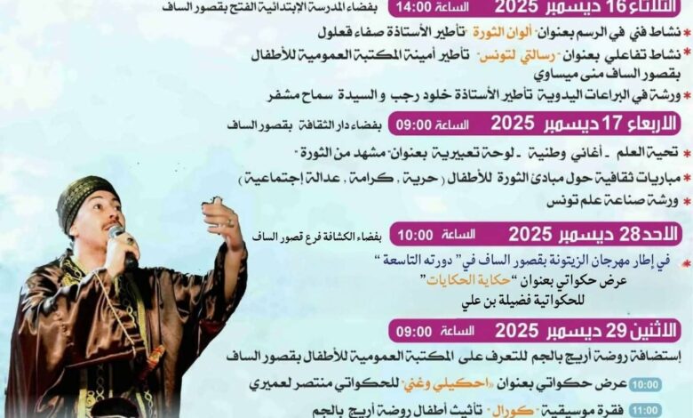 تحت اشراف وزارة الشؤون الثقافية ومندوبيتها الجهوية بالمهدية والمكتبة الجهوية بالمكان تنظم المكتبة العمومية للأطفال بقصور الساف التي تشرف على ادارتها الاستاذة منى ميساوي وتحت شعار”مع الكتاب نلتقي و بنور الكتاب نرتقي”فعاليات”الأيام التنشيطية للطفل”وذلك تسجيدا لاهداف الخطة الوطنية للترغيب في المطالعة وإحتفالا بعيد الثورة التونسية وتزامنا مع عطلة الشتاء 2025.