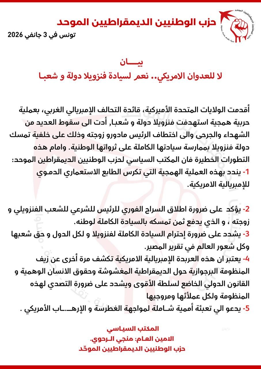 أصدر حزب الـــوطنيين الـــديمقراطيين الـــموحد الذي يقوده منجي الــرحوي بيانا شديد اللهجة تحت عنوان: لا للعدوان الامريكي على فنزويلا، نعم للسيادة الكاملة لفنزويلا. وهذا ما ورد فيه ؛
