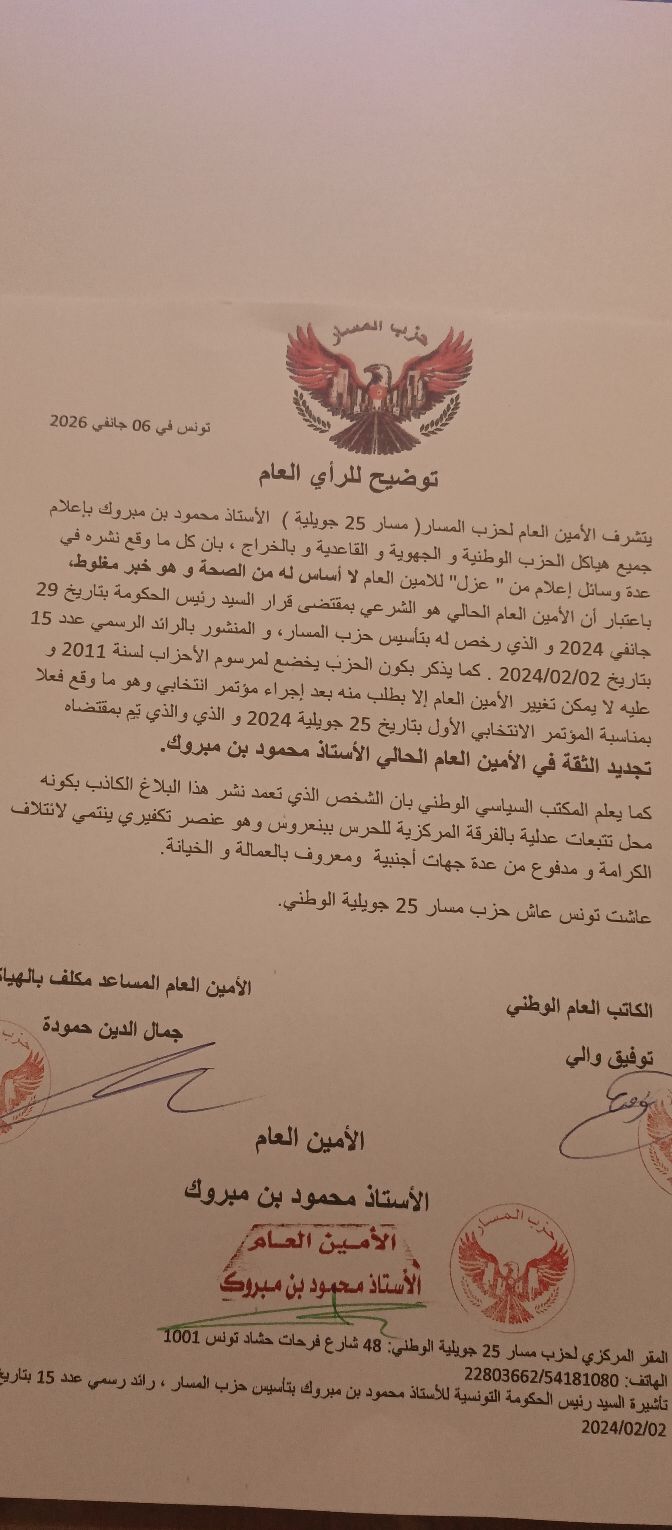 أصدر حزب المسار بلاغ للرأي العام، نفى فيه خبر تنحية الأمين العام لحزب المسار الأستاذ محمود بن مبروك،