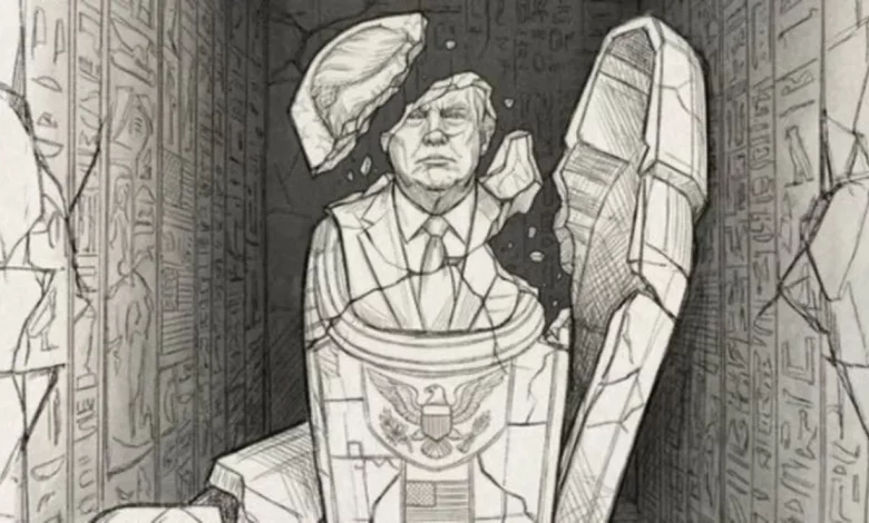 فقد نشر خامنئي اليوم الاثنين على حسابه باللغة الفارسية في أكس، صورة لتمثال ترمب على شكل مجسم فرعوني “محطماً”.