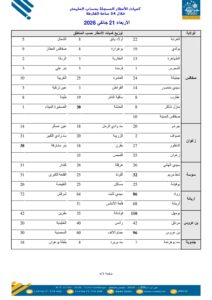 نشر المعهد الوطني للرصد الجوي قائمة بكميات الأمطار المسجلة في مناطق مختلفة من البلاد وهي على النحو التالي: