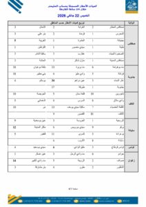 نشر المعهد الوطني للرصد الجوي قائمة لكميات الأمطار المسجلة من يوم الأربعاء 21 جانفي 2026 على الساعة 07 صباحا إلى يوم الخميس 22 جانفي 2026 على الساعة 07 صباحا :