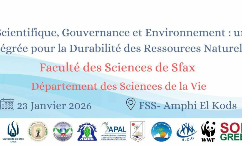 Dans un contexte marqué par l’aggravation des défis environnementaux auxquels font face la Tunisie et le monde, et dans une volonté de consacrer des approches scientifiques durables dans la gestion des ressources naturelles, la Faculté des Sciences de Sfax, et plus particulièrement le Département des Sciences de la Vie, accueille ce vendredi 23 janvier 2026 une manifestation scientifique intitulée :