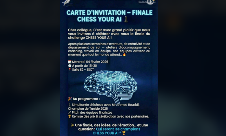 ينظم ظهر اليوم 4 فيفري الجاري قسم التصرف والتسويق بالمدرسة العليا للتجارة بتونس نهائي تحدّي ” CHESS YOUR AI “، وذلك بـقاعة E2 بهذه المؤسسة وقد شارك في هذا التحدّي الأكاديمي ذي الطابع الابتكاري 14 فريقًا طلابيًا عملوا على مشاريع تجمع بين الذكاء الاصطناعي، التفكير الاستراتيجي، التصرف والإبداع وذلك في إطار تجربة تحاكي روح الهاكاتون.
