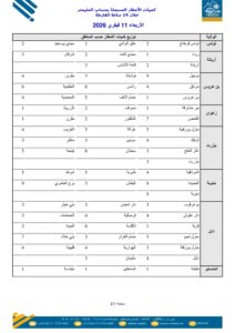نشر المعهد الوطني للرصد الجوي قائمة بكميات الأمطار المسجلة من يوم الثلاثاء 10 فيفري 2026 على الساعة 07 صباحا إلى يوم الأربعاء 11فيفري 2026 على الساعة 07 صباحا وهي على النحو التالي:
