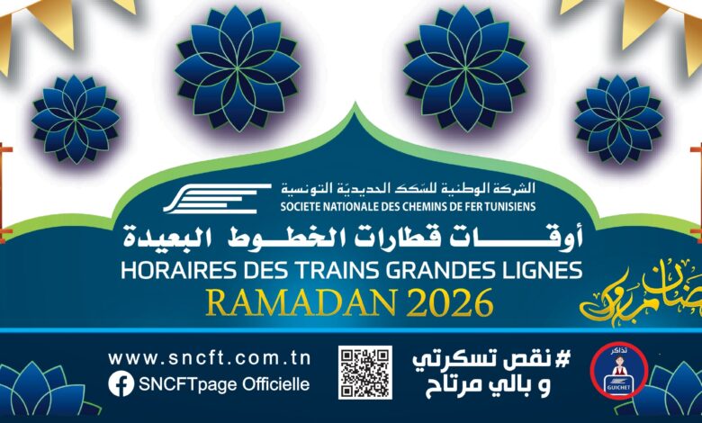 أوقات قطارات الخطوط البعيدة خلال شهر رمضان لسنة 2026 - الخط الدّولي تونس - عنابة الرّابط: https://shorturl.at/4qV0O - خطّي تونس - غار الدماء وتونس - بنزرت الرّابط: https://shorturl.at/bCMKg - خطّ تونس - القلعة الخصبة الرّابط: https://shorturl.at/wDon4 - خطّي تونس - توزر و المتلوّي - الرّديف الرّابط: https://shorturl.at/X6EOI - خطّي توزر - تونس وتونس - نابل الرّابط: https://shorturl.at/amVoH
