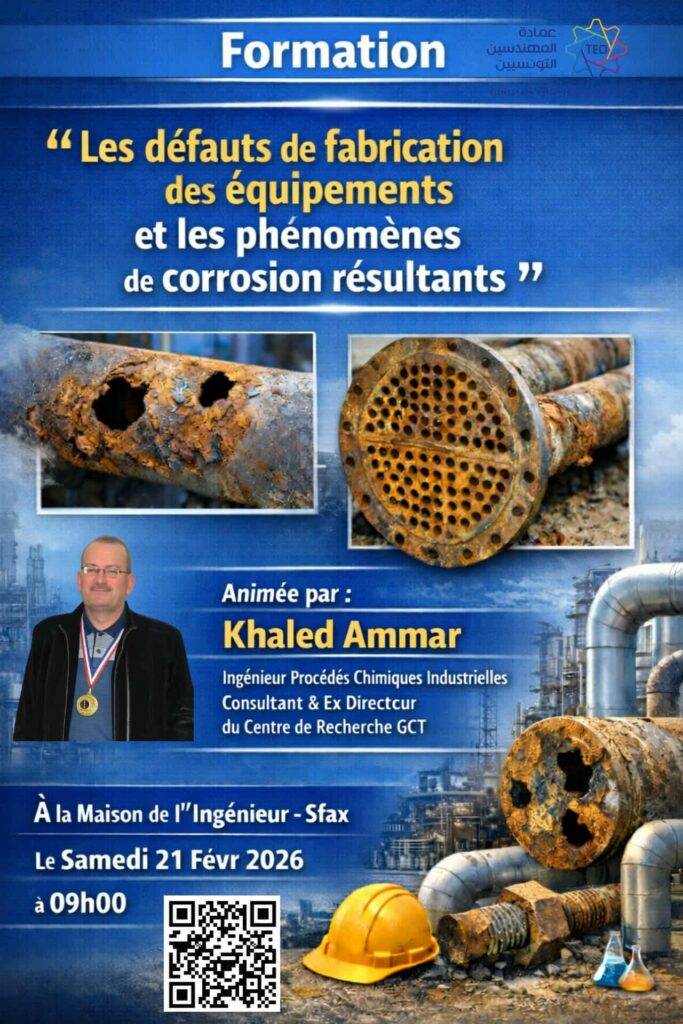 تنظّم عمادة المهندسين التونسيين بصفاقس يوم السبت 21 فيفري 2026، انطلاقًا من الساعة التاسعة صباحًا بدار المهندس بصفاقس، دورة تكوينية متخصّصة بعنوان: “عيوب تصنيع المعدّات والظواهر الناتجة عنها من تآكل”. تأتي هذه المبادرة في إطار تعزيز الكفاءات الهندسية وترسيخ مبادئ الجودة والسلامة داخل المؤسسات الصناعية.