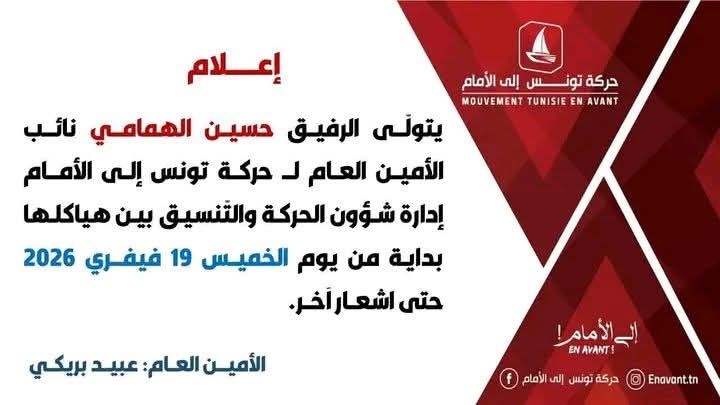 أعلنت حركة تونس إلى أمام تولي حسين الهمامي نائب الأمين العام لحركة تونس إلى الأمام مهام إدارة شؤون الحركــة والتنسيق بين هياكـلها بداية مــن يوم الأمــس الخميس 19 فيفري 2026 حــتى إشعار آخر.