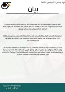 استنكرت الجمعية التونسية لحكام كرة القدم، اليوم الإثنين 23 فيفري 2026، "ما يتعرّض له الحكام من حملات تشويه واعتداءات". وأكدت الجمعية في بيان عن تضامنها الكامل مع الحكم المساعد رسلان بومنيجل. وفي مايلي نصّ البيان: