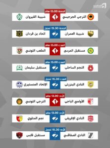 أعنلت التلفزة التونسية انها ستبث كل مباريات الجولة 22 من منافسات الرابطة المحترفة الأولى لكرة القدم وفقا للبرنامج التالي: