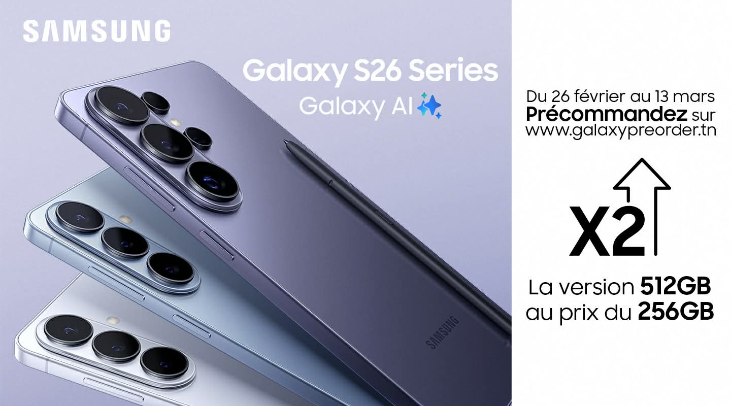 تتوافر أجهزة Galaxy S26 وGalaxy S26+ وGalaxy S26 Ultra للطلب المسبق اعتباراً من يوم 25 فيفري https://www.galaxypreorder.tn/عبر