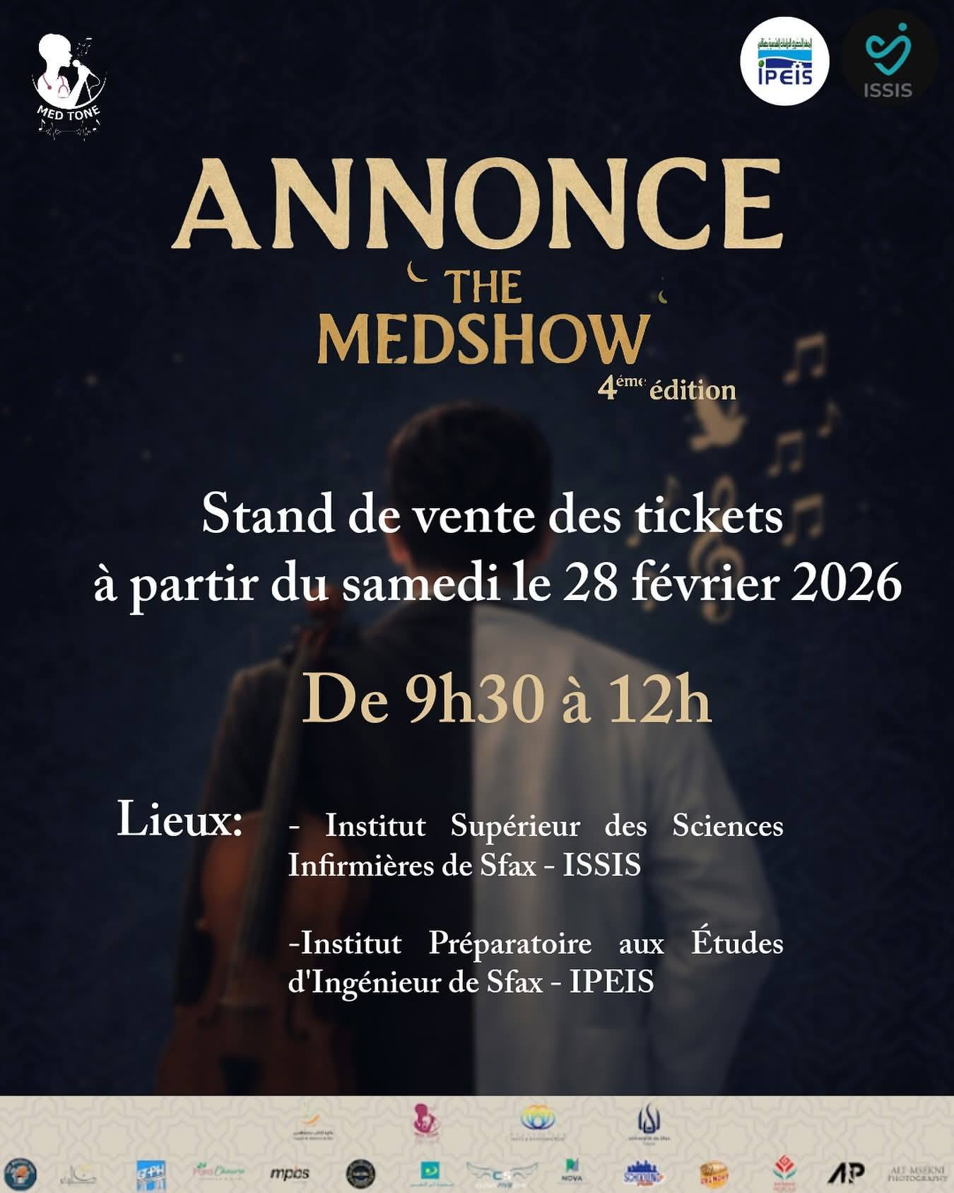 في إطار الجمع بين الرسالة الإنسانية للطب وقيم الفنّ النبيل، بنظم نادي طلبة كلية الطب بصفاقس “ماد شو” ، بالشراكة مع جمعية صحة وبيئة، حفلًا فنيًا خيريًا يجمع بين الفن والموسيقى الأصيلة وروح التضامن، وذلك يوم الأربعاء 4 مارس 2026 بداية من الساعة التاسعة والنصف ليلًا، بفضاء المسرح البلدي بصفاقس.