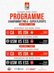 وفي نفس الوقت على ارضية قاعة مزالي ستلعب مباراة الإتحاد المنستيري والنجم الرياضي الساحلي يوم الخميس.