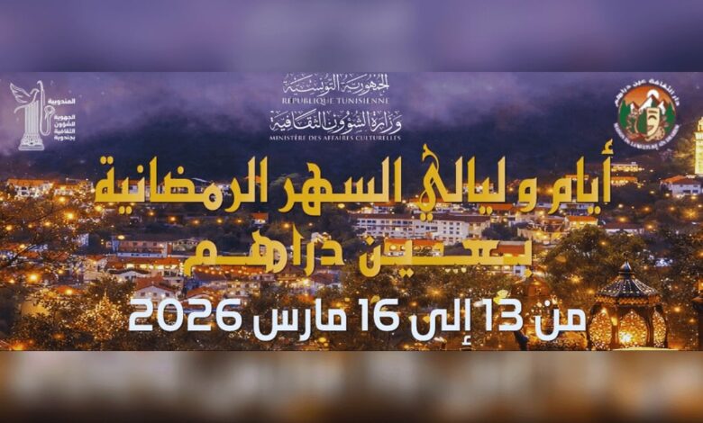 ومن جهتها تنظم دار الثقافة عين دراهم فعاليات الدورة الثالثة لـ” آيام وليالي السهر الرمضانية”والتي تفتتح يوم 13 مارس الجاري بعرض”التخميرة” بقيادة مراد باشا فعرض موسيقي لفرقة”نغم”بقيادة وسيم بلالي يوم 14 مارس الجاري فعرض تنشيطي للأطفال مع مجموعة المهف شو يوم 15 مارس الجاري فالاختتام يوم 16 مارس الجاري مع الاحتفال باليوم الوطني للباس التقليدي بسهرة”الطفل والعائلة”مع مجموعة من الفقرات التنشيطية